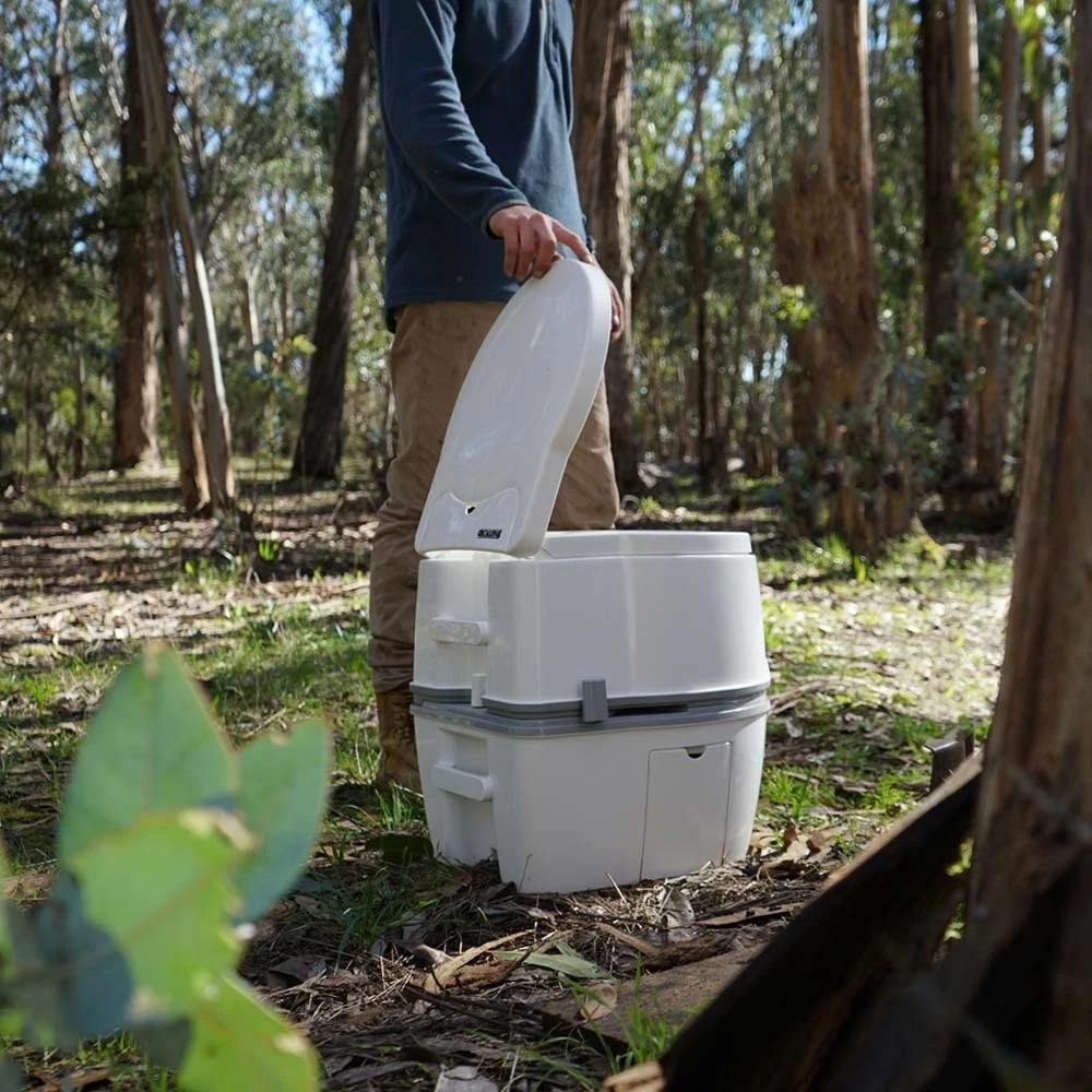 It’s comprised of a flush water tank and toilet bowl with a removable seat and a lower waste-holding tank with a 21L capacity. This unit is constructed from lightweight and high-quality plastic, so it will hold up on your many adventures. This portable toilet comes with a piston pump flushing system and has a level indicator, so you’ll know when it needs to be emptied. It even has a toilet paper holder so that you can get down to business without having to hold on to your bog roll.